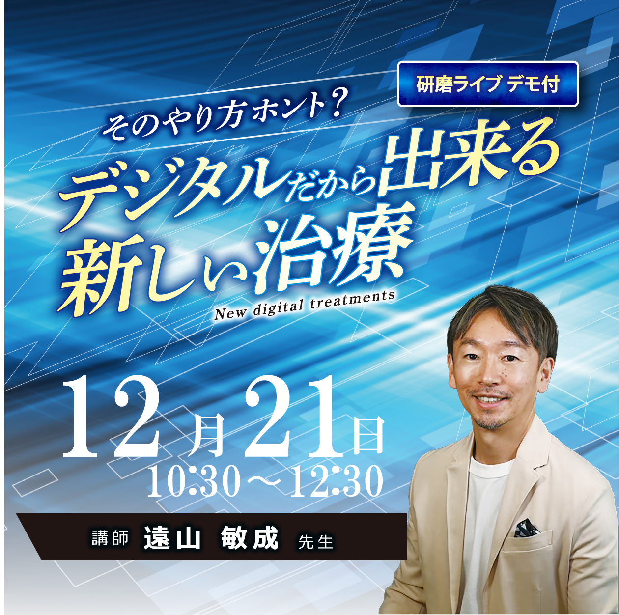 | POINT | Zrオーバーレイ・ベニア・3Dプリント義歯・PEEK・フェイススキャンなど最新のデジタル歯科治療についてご講演いただきます。さらに研磨のライブ デモンストレーションあり!是非ご参加ください。 |